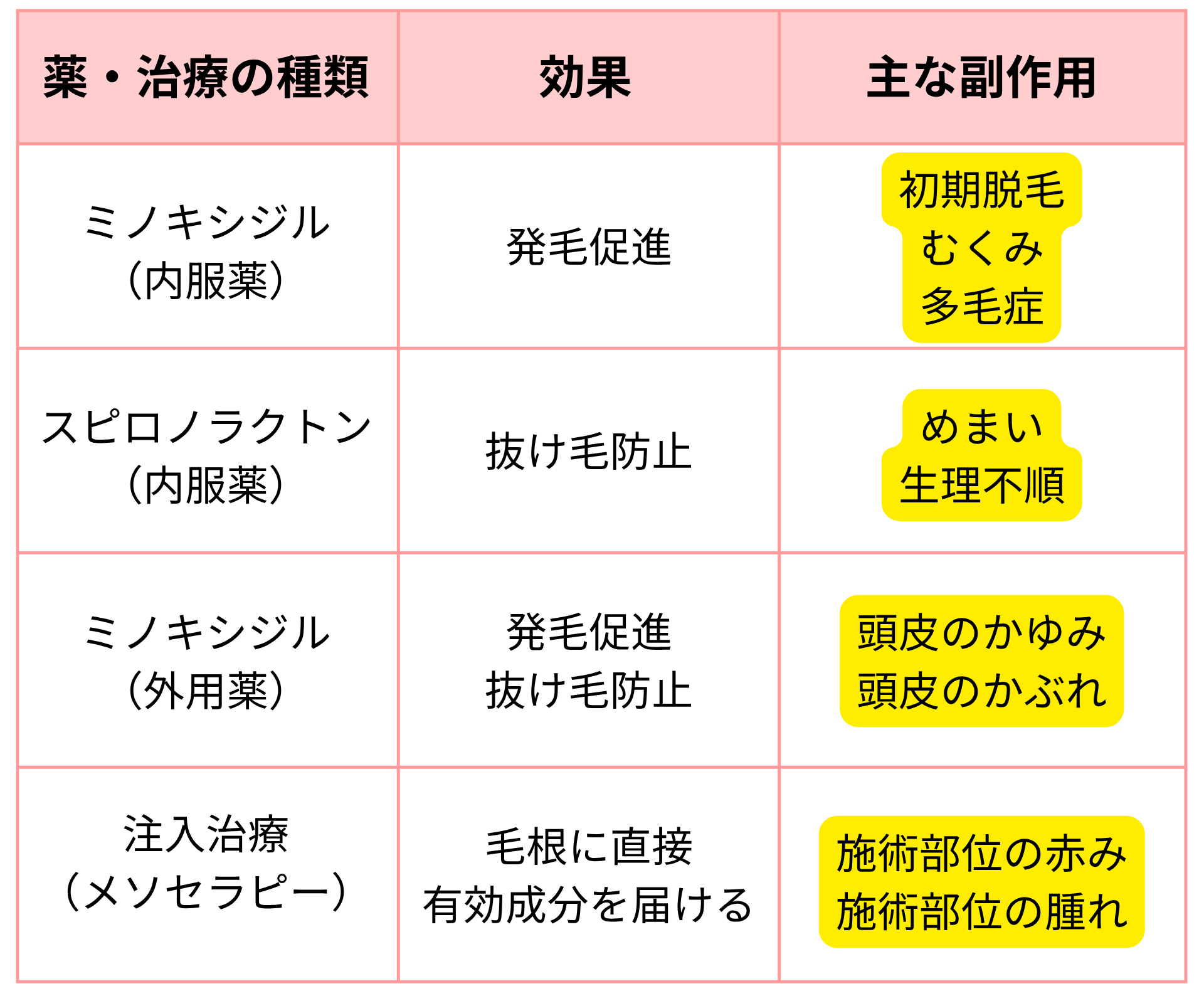 薄毛治療の薬には、初期脱毛・むくみ・多毛症・めまいなど、副作用のリスクがあります。