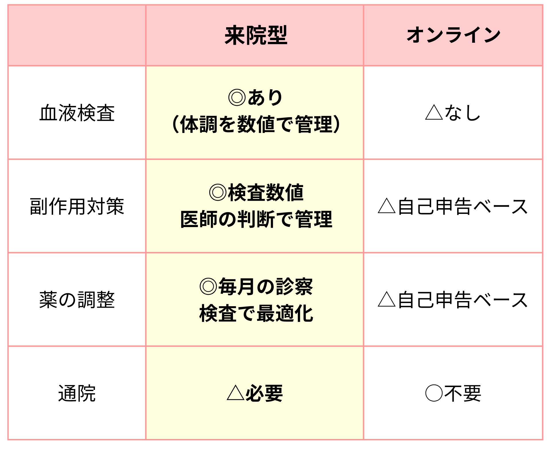 - 毎月の血液検査が無料だから、副作用が心配な方も安心して続けられる